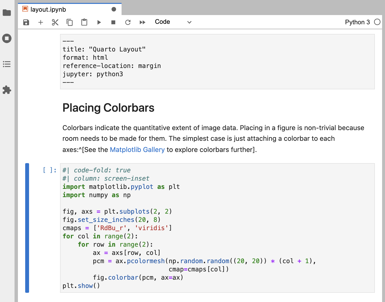 Document with Quarto Layout title at the top followed by Placing Colorbars header with text below it. Next to the text is a footnote in the page margin. Below the text is a toggleable code widget to hide/reveal the code followed by four plots displayed in two rows and two columns.