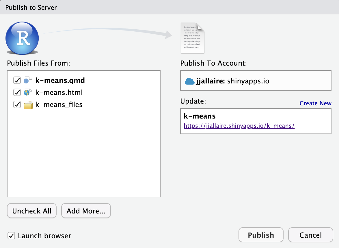 You can then deploy your interactive document using the quarto_publish_app() function of the quarto package. You can do this as follows (working from the directory that contains your document):