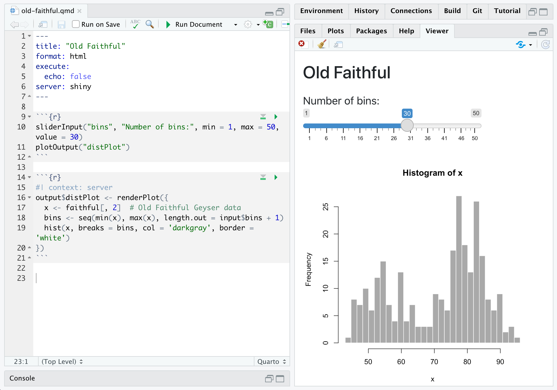 Note that you need RStudio v2022.07 or a later version in order to run Quarto interactive documents. You can download the latest release at https://posit.co/download/rstudio-desktop/.