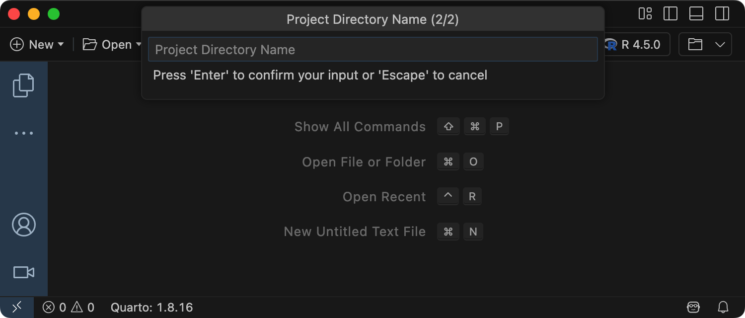 To create a new website project within Positron, execute the Quarto: Create Project command from the command-palette: