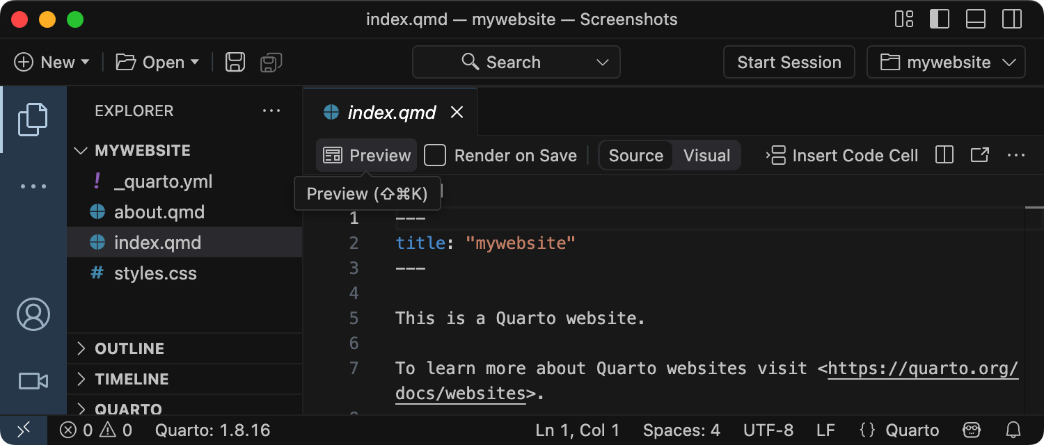 The preview will show to the right of the source file. As you re-render index.qmd or render other files like about.qmd, the preview is automatically updated.