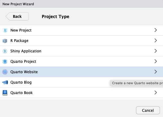To create a new website project within RStudio, use the New Project command and select Quarto Website: