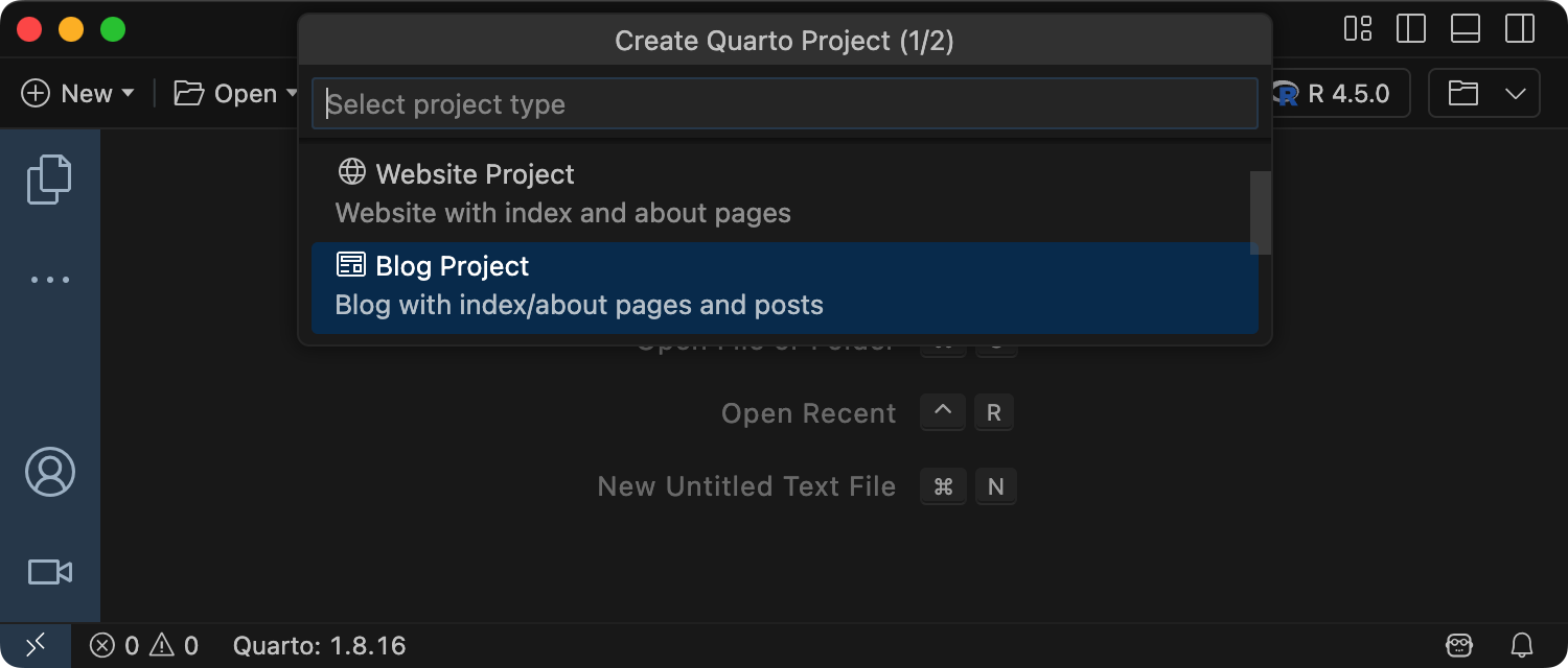 To create a new blog project within RStudio, use the New Project command and select Quarto Blog: